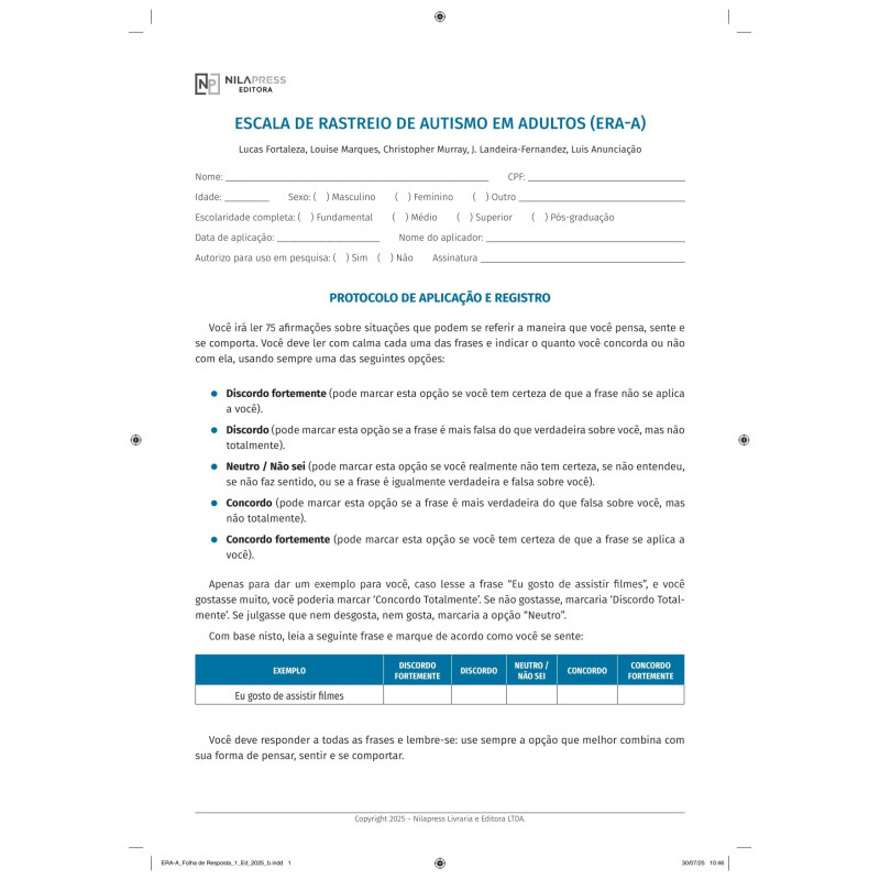 A Escala de Rastreio de Autismo em Adultos (ERA-A) é um instrumento de uso multidisciplinar,que visa identificar sintomas associados ao Transtorno do Espectro Autista (TEA) em adultos. Trata-se de uma medida de autorrelato, formada por 75 afirmações sobre comportamentos e percepções relacionadas ao TEA. A ERA-A produz um Escore geral e resultados detalhados